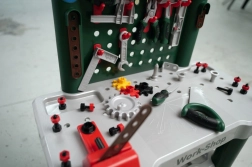 Enthalten ist ein umfangreiches Set hochwertiger Zubehörteile: Schlitz- und Kreuzschlitzschraubendreher, Schraubenschlüssel, Wasserwaage, Zange und Feile, außerdem Hammer, Säge, Winkel, Schrauben, Muttern und Konstruktionsleisten. Spielerisch trainieren Kinder Feinmotorik, Koordination und logisches Denken beim Verbinden der Leisten und beim Schrauben.