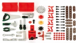 Komplette Ausstattung einschließlich Schraubendreher, Schraubenschlüssel, Wasserwaage, Zange, Feile, Hammer, Säge, Winkel, Schrauben, Muttern und Konstruktionsleisten. Kinder haben alles Nötige für erste Projekte und spielerisches Lernen.
