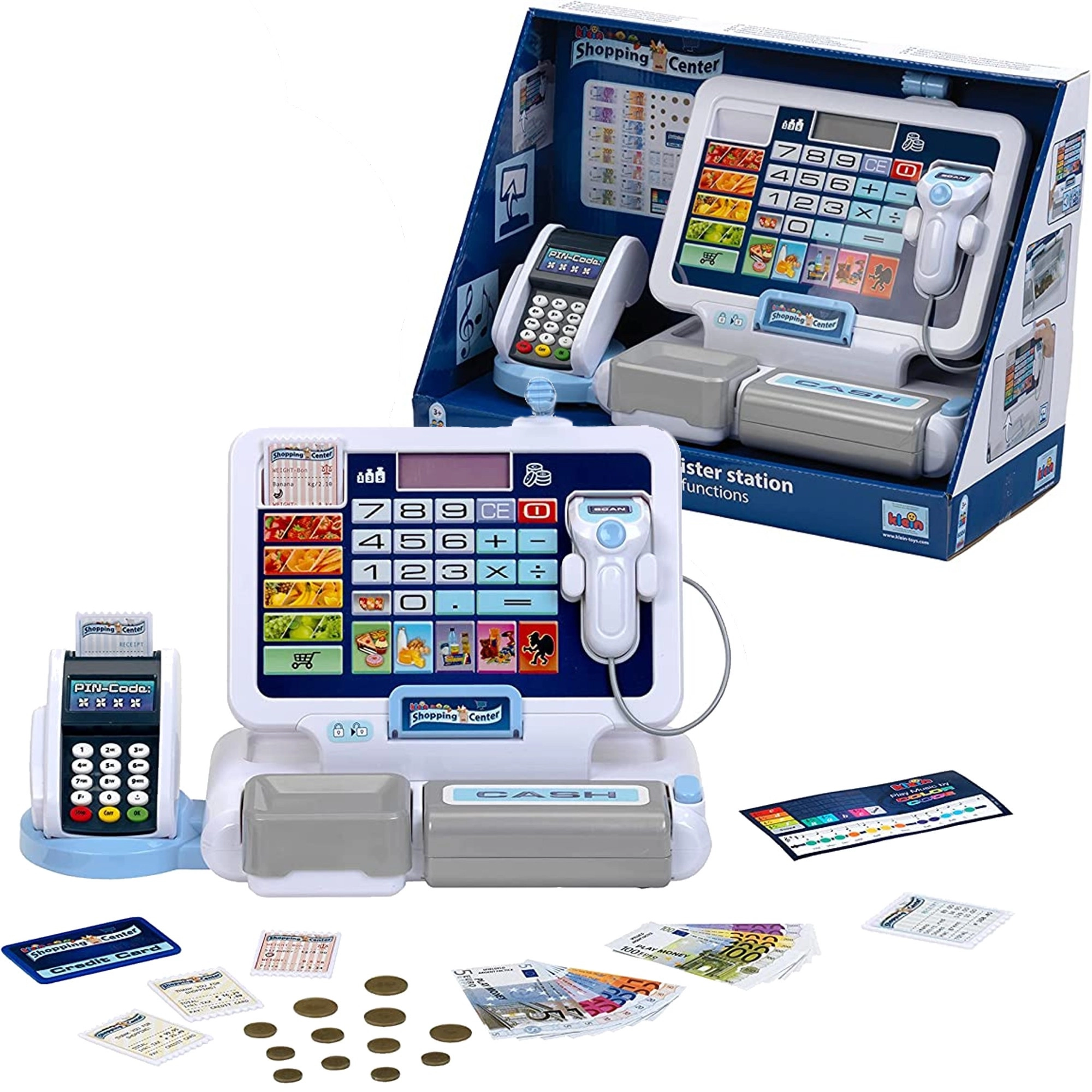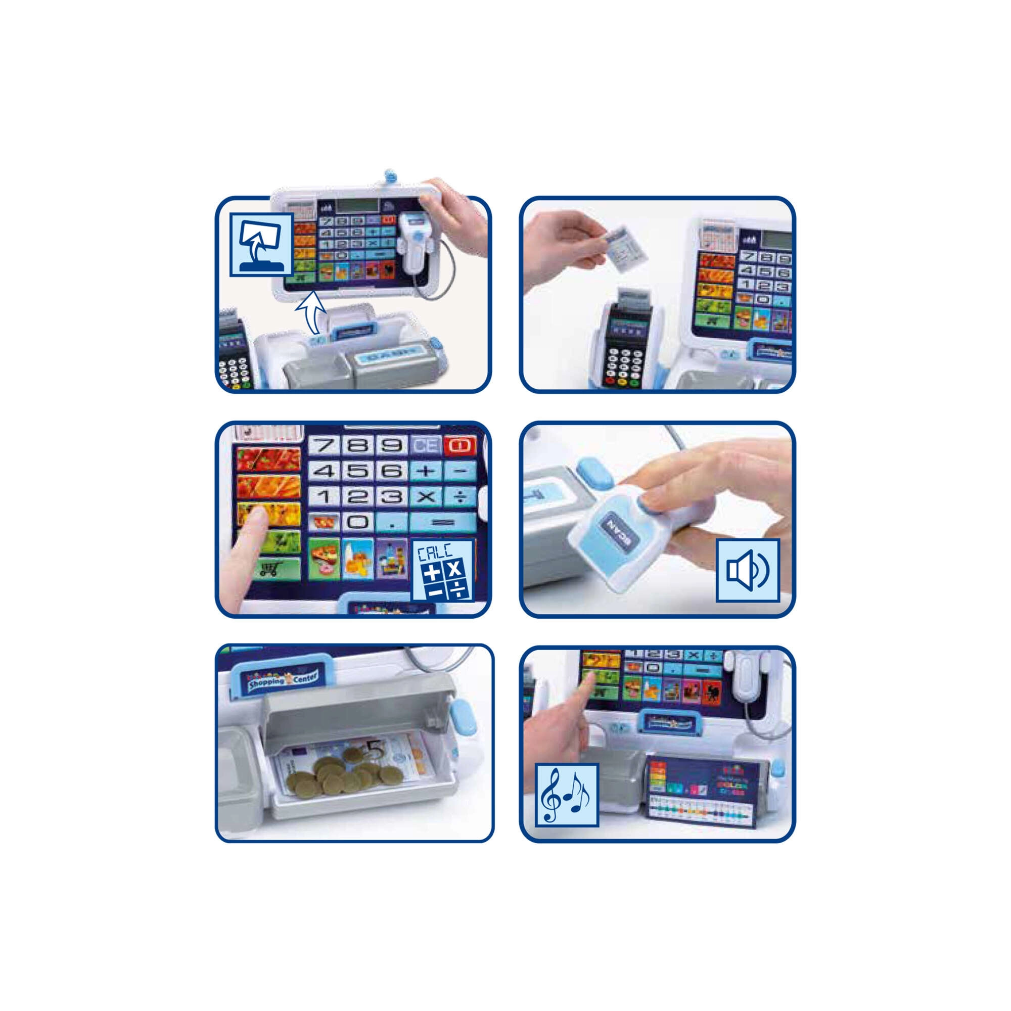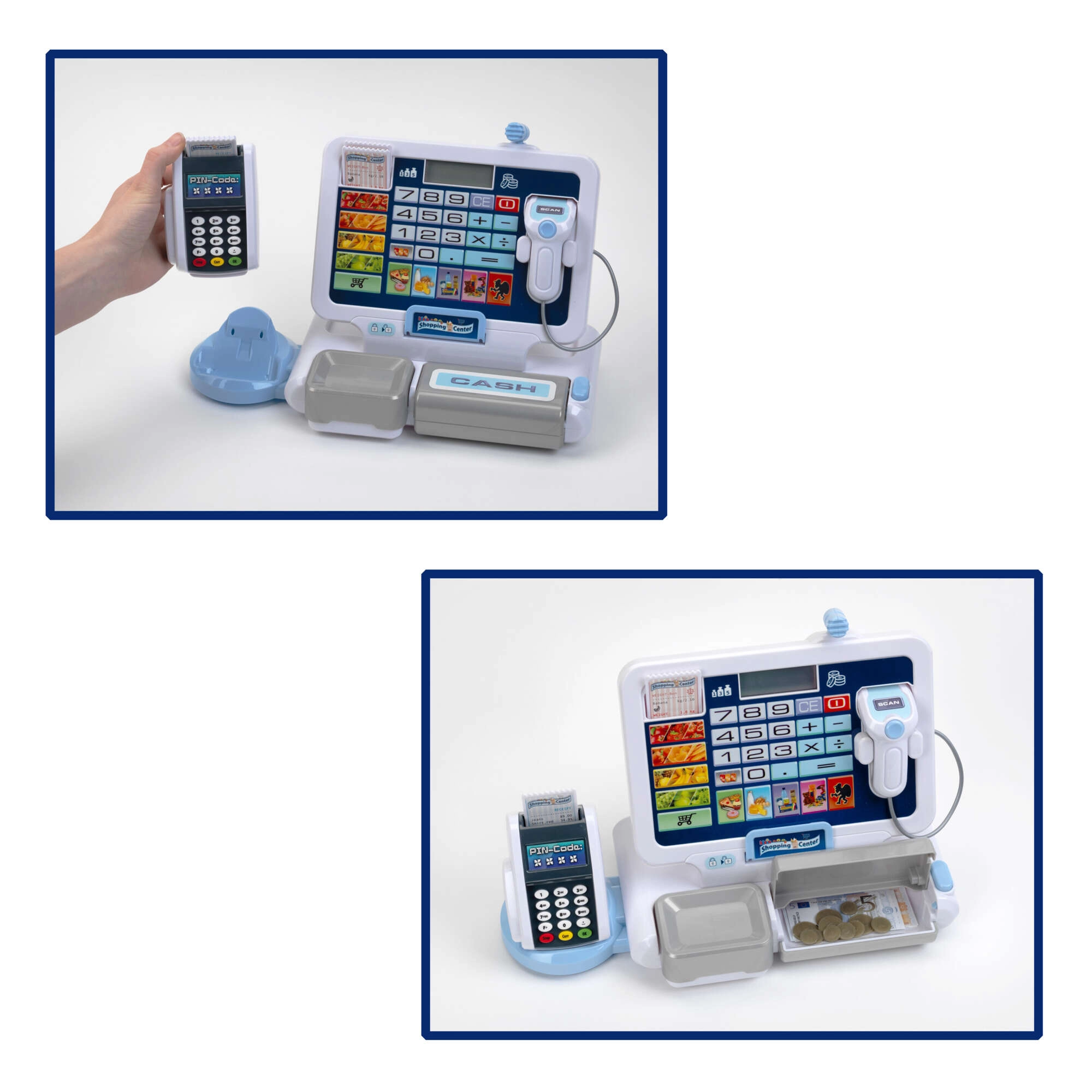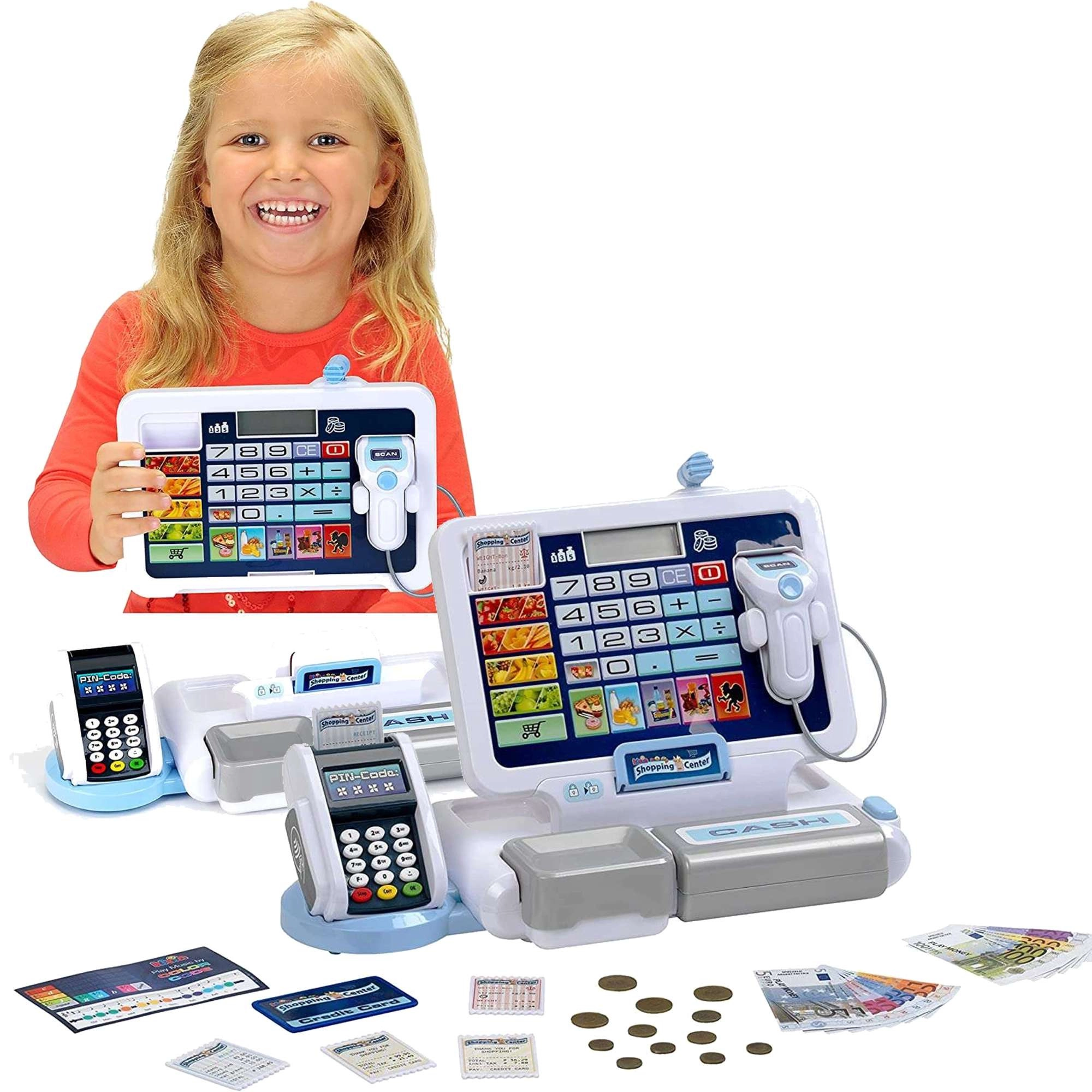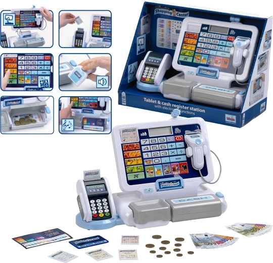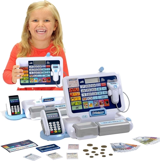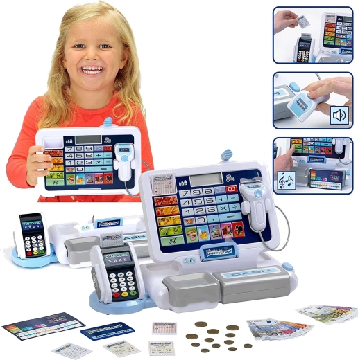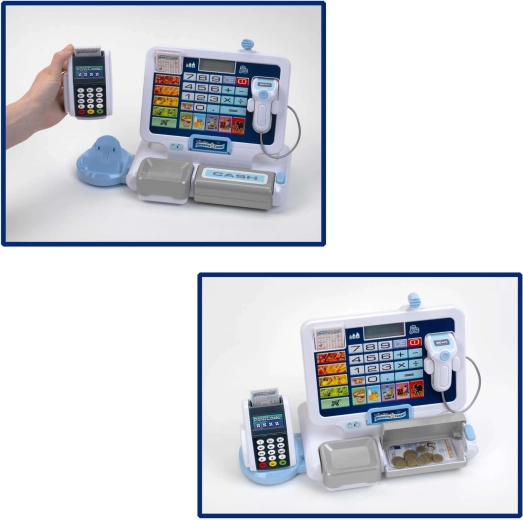 Die elektronische Kinderkasse imitiert eine echte Kasse: Sie hat ein übersichtliches Display mit Taschenrechner, einen Kartenleser, einen Scanner und eine ausklappbare Bargeldschublade mit dem bekannten „Klick“. Kinder können Waren „scannen“, Preise eingeben und alles automatisch addieren lassen. Das grau-weiße Design wirkt modern und klar.