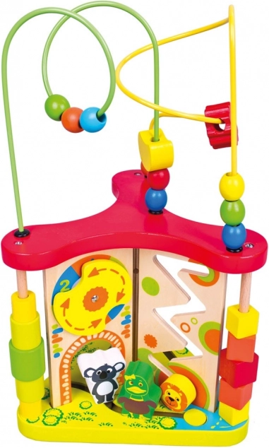 Dieses multifunktionale hölzerne Aktivitätslabyrinth der Marke Bino wurde entwickelt, um Kinder zu begeistern und gleichzeitig zu fördern. Perlen auf Metalldrähten, dreh- und schiebbare Elemente sowie illustrierte Tiermotive wecken Neugierde, Konzentration und die Hand-Auge-Koordination.