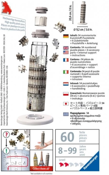 Dieses 3D Puzzle ist ideal für Jungen und Mädchen, da es ihre Problemlösungsfähigkeiten fördert und ihre Geduld sowie Aufmerksamkeit für Details verbessert. Das Puzzle ist mit Präzision und Qualität entworfen und fängt das ikonische architektonische Wunder des Schiefen Turms von Pisa in fesselndem 3D ein. Das Zusammensetzen der einzelnen Teile zur Rekonstruktion dieses berühmten Wahrzeichens vermittelt ein Gefühl des Erfolgs und gibt Einblick in die architektonischen Wunder der Welt. Ob als eigenständige Aktivität oder als Erlebnis für die ganze Familie und Freunde, dieses Puzzle bringt Stunden voller Spaß und ein Stück der reichen italienischen Geschichte und Schönheit in Ihr Zuhause.