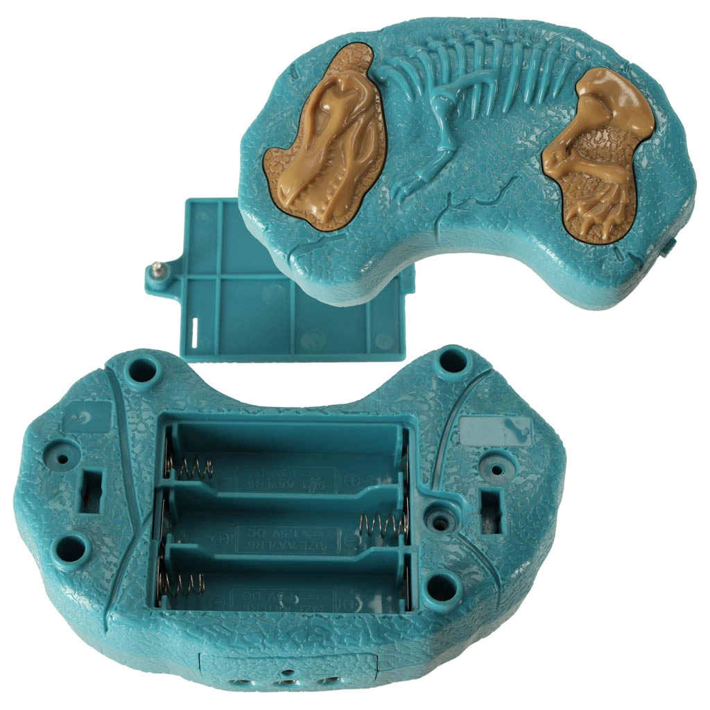 Der Fernbedienung in Form einer Versteinerung mit zwei Tasten erleichtert die Steuerung der Bewegungen und Geräusche des Dinosauriers.