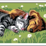 CreArt – das ist kreative Unterhaltung buchstäblich für jeden. Werden Sie für einen Moment zum Profi-Maler und gestalten Sie Ihr eigenes Bild. Dieser schläfrige Hund und die Katze bringen jede Wand zum Strahlen. Färben Sie nach und nach die einzelnen Flächen gemäß der Anleitung aus (jede Zahl auf der Leinwand entspricht einer bestimmten Farbe) und genießen Sie die Freude an kreativer Arbeit, die Sie stundenlang beschäftigt. Malen ist eine großartige Tätigkeit, die nicht nur Spaß macht, sondern auch die Geschicklichkeit trainiert, die Konzentration verbessert und allen Künstlern Zufriedenheit und Stolz garantiert. Das Set enthält alles, was Sie zum Malen benötigen: eine hochwertige, stabile Leinwand mit Bildvorlage und nummerierten Flächen, ein Set Acrylfarben, einen Pinsel, einen Kartonständer für die Farbbecher sowie einen Rahmen. Die ausgemalten Flächen ergeben ein professionell wirkendes Kunstwerk. Sobald das Bild fertig ist, lassen Sie es trocknen und rahmen Sie es in den im Set enthaltenen Rahmen ein. Malen war noch nie so einfach.