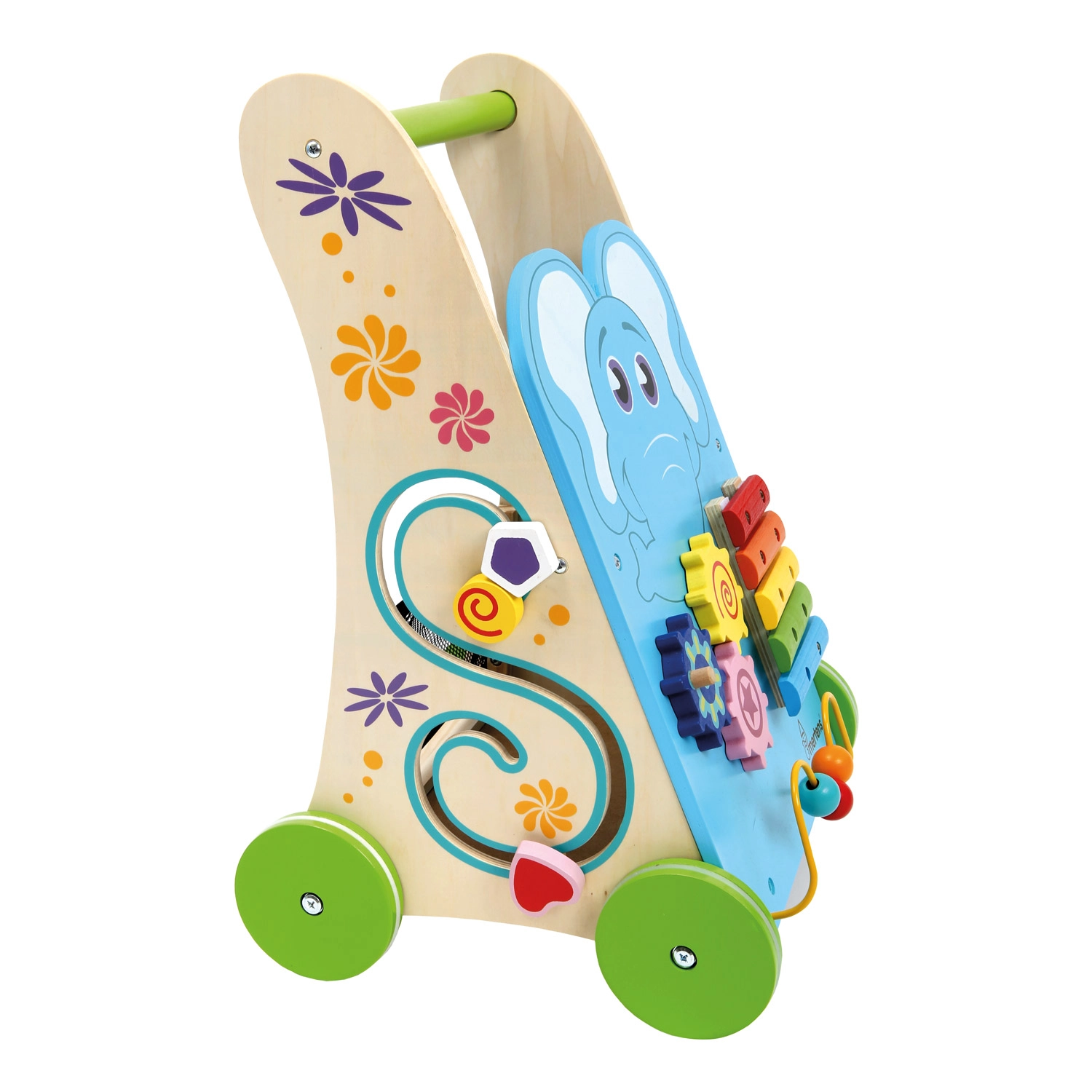 Dieser multifunktionale Holz-Lauflernwagen hilft Kindern, Balance, Koordination und Feinmotorik zu trainieren. Die Front ist voller Aktivitäten: ein Xylophon mit Schlägel, Zahnradgetriebe, ein Perlenlabyrinth und ein Steckspiel, die Konzentration und logisches Denken fördern.