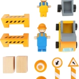 Arbeiterfiguren, Lastwagen, Kegel, Schilder und Absperrungen schaffen eine komplette Baustelle und regen zu fantasievollen Geschichten an.