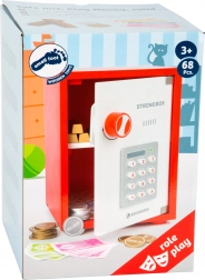 Das Set umfasst insgesamt 68 Teile – Papier-Eurobanknoten, goldene und silberne Münzen sowie hölzerne Goldbarren. Dank der Abmessungen von 20 × 20 × 27 cm ist der Safe geräumig genug für alle Kinderschätze und zugleich stabil beim Spielen. Das Spielzeug ist ab 3 Jahren geeignet und fördert Kreativität, soziale Fähigkeiten und Rollenspiel.