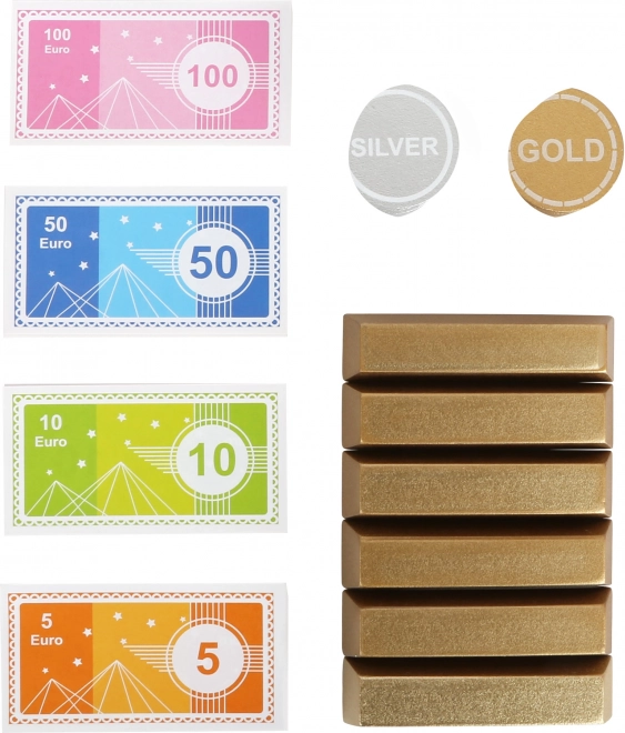 Enthalten sind Euro-Banknoten, goldene und silberne Münzen sowie hölzerne Goldbarren. Perfekt, um den Wert von Geld, das Rechnen und Rollenspiele als Banker oder Kundschaft zu üben.