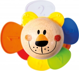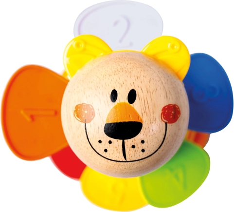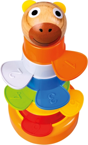 Dieser fröhliche Turm verbindet Spielen und Lernen in einem. Sechs farbige Becher werden auf eine stabile Basis gestapelt und durch eine Holzkugel in Bärenkopfform ergänzt. Kinder können die Elemente nicht nur stapeln, sondern auch ineinander stecken, nach Größe oder Farbe sortieren und erste Zahlen kennenlernen.