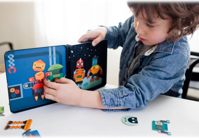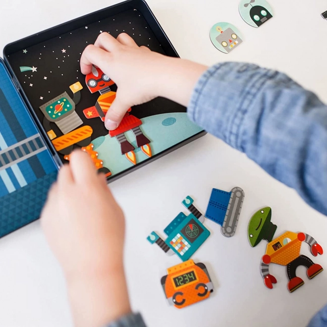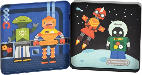 Das Magnetset mit Robotern bietet tollen Spaß für Kinder ab 3 Jahren. Dank der mehr als 25 magnetischen Teile können kleine Konstrukteure unendlich viele Kombinationen von Roboterfiguren zusammenstellen und so Fantasie und Kreativität entwickeln. Die Blechdose lässt sich fest verschließen und verbirgt im Inneren zwei farbige Szenen, an denen die Teile leicht haften.