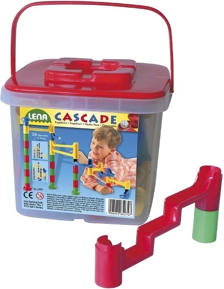 Das Cascade-Bauset bringt eine farbenfrohe Kaskade voller Spaß. Aus 29 Teilen lassen sich vielfältige Kugelbahnen gestalten, auf denen die Kugel über verschiedene Ebenen und Hindernisse saust. Der praktische Eimer mit Griff erleichtert Aufbewahrung und Transport, sodass Kinder zu Hause wie auch unterwegs spielen können.