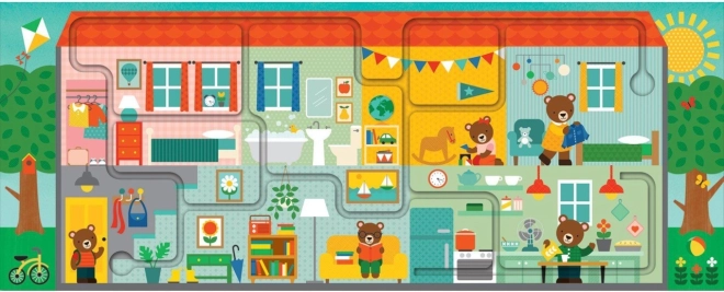 Dieses kreative Set von PETIT COLLAGE vereint Puzzle und interaktives Labyrinth in einem Spiel, das Kinder unterhält und gleichzeitig fördert. Nach dem Zusammensetzen der 10 großen Teile entsteht ein langes Bild des Hauses (53 × 21,5 cm), in dem Kinder mit dem Finger der markierten Strecke folgen und dabei 20 versteckte Gegenstände entdecken.