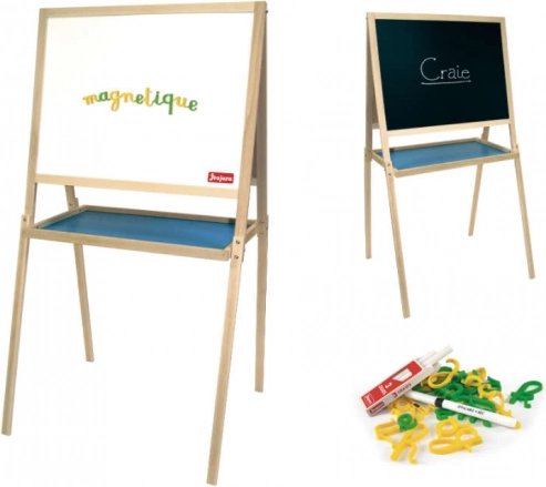 Die Multifunktionstafel von Jeujura ist eine großartige Ergänzung für jedes Kinderzimmer oder Spielzimmer. Sie verfügt über zwei Tafeln auf einer stabilen Holzkonstruktion, die zwei verschiedene Oberflächen bieten: eine schwarze Tafel zum Schreiben und Zeichnen mit Kreide und eine weiße Tafel zum Beschreiben mit Stift.