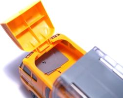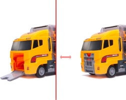 Der Sattelschlepper hat einen transparenten Deckel und Fächer für alle 6 Autos. Kinder haben die Fahrzeuge stets griffbereit und das Set lässt sich leicht verstauen und transportieren.