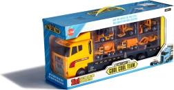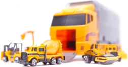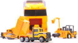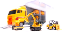 Dieser 2-in-1-Transporter und Spielset verbindet Spaß mit Praktikabilität. Der Sattelschlepper mit transparenten Seiten fasst sechs detailreich gestaltete Baufahrzeuge und dient zugleich als kompakter Organizer. Kinder genießen realistisches Bauspiel dank beweglicher Teile und der cleveren ausfahrbaren Rampe per Knopfdruck.