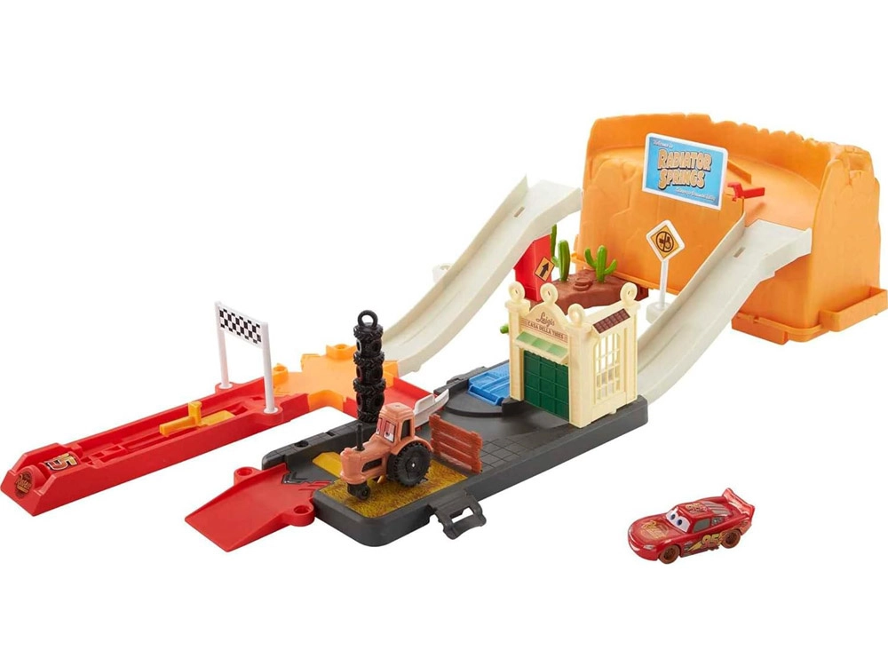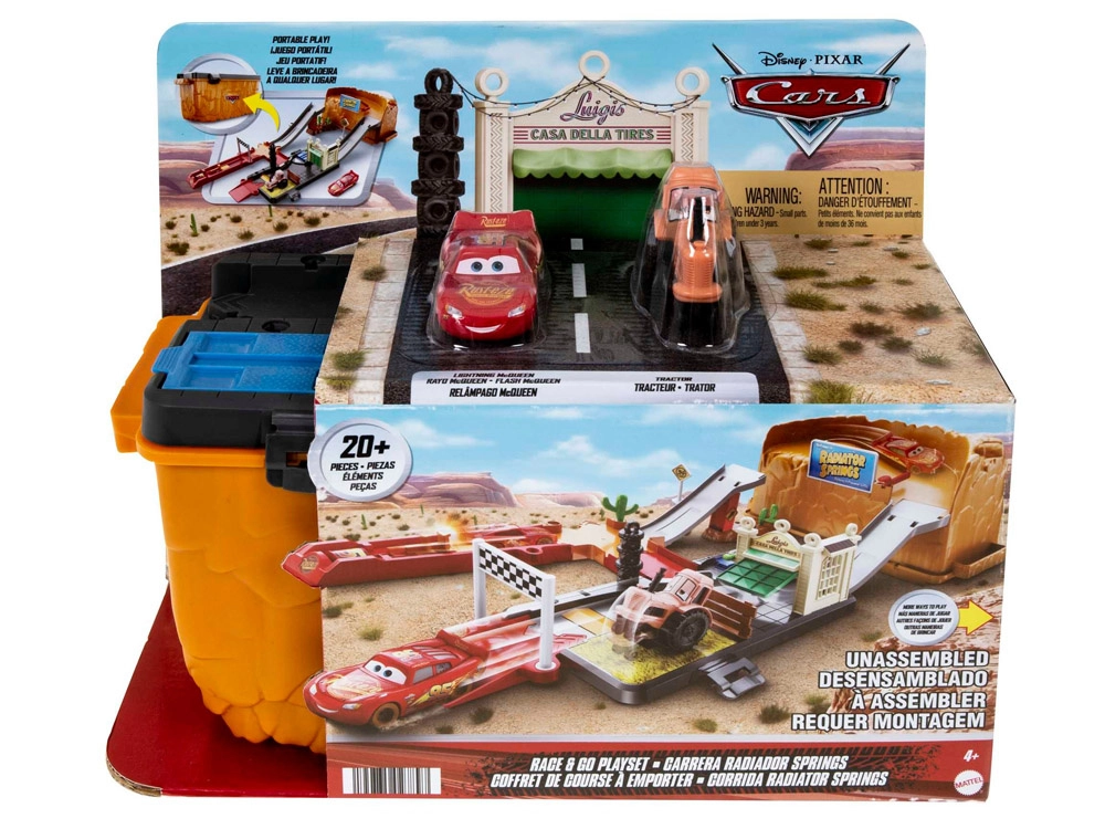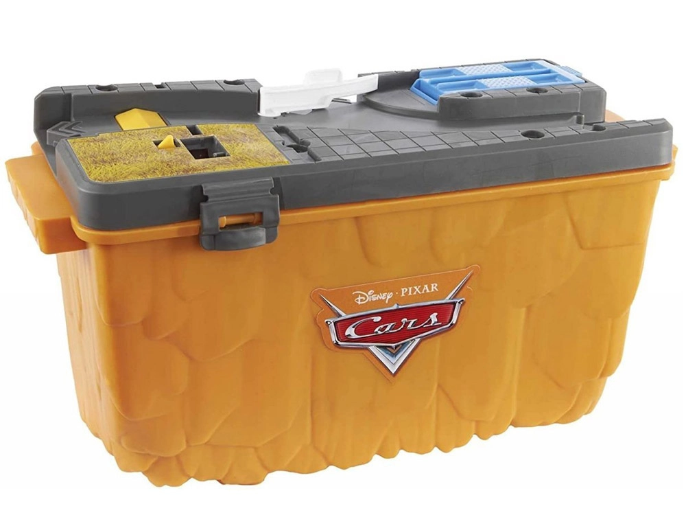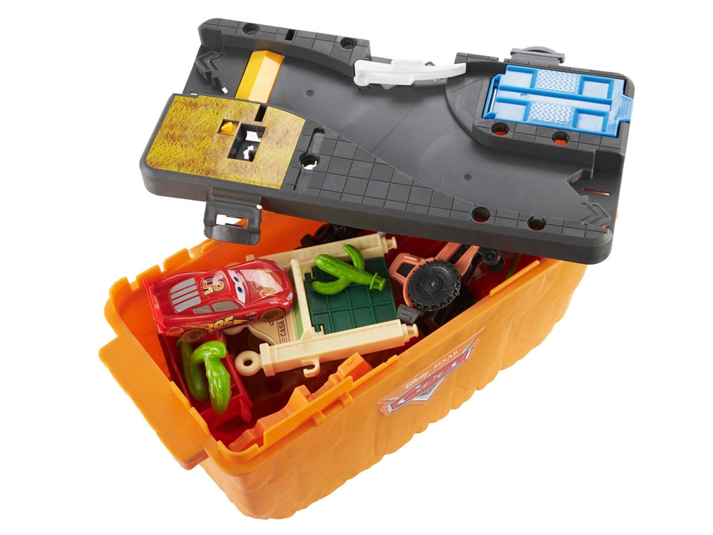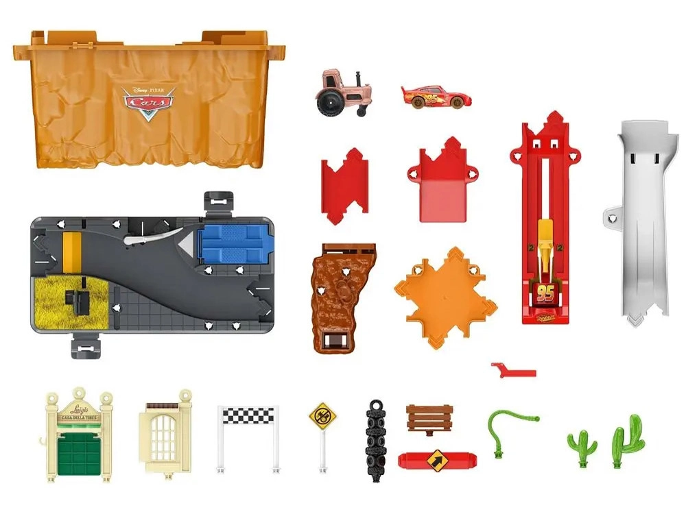 Baut eine Rennstrecke inspiriert von Radiator Springs und schießt Lightning McQueen per Druck auf die Taste mit der Nummer 95 los. Beobachtet, wie er rasant über die Rampen sprintet, enge Kurven nimmt und ins Ziel rast. Dank des durchdachten Designs ist die orangefarbene Box zugleich Spielelement – sie imitiert Felswände und nach dem Spielen lässt sich darin alles bequem verstauen.