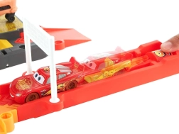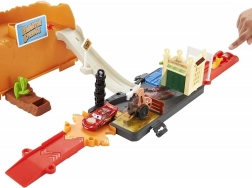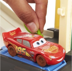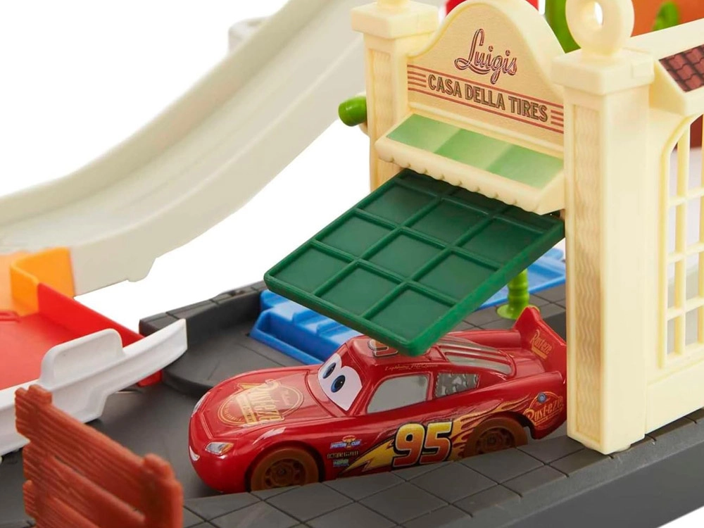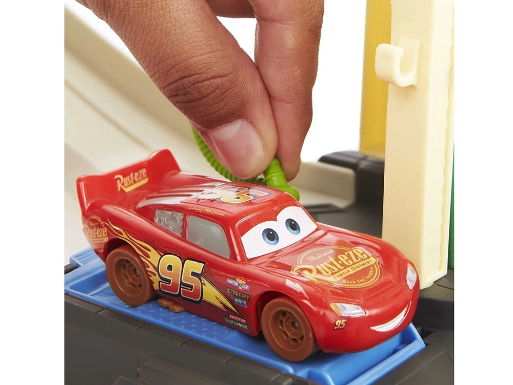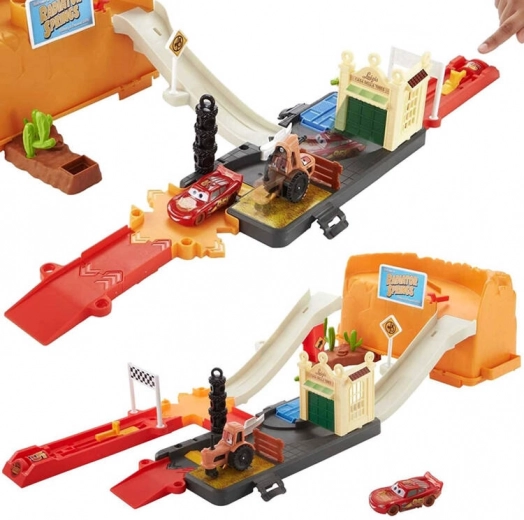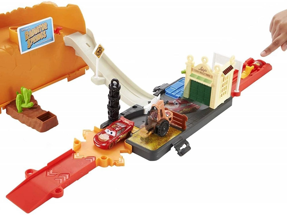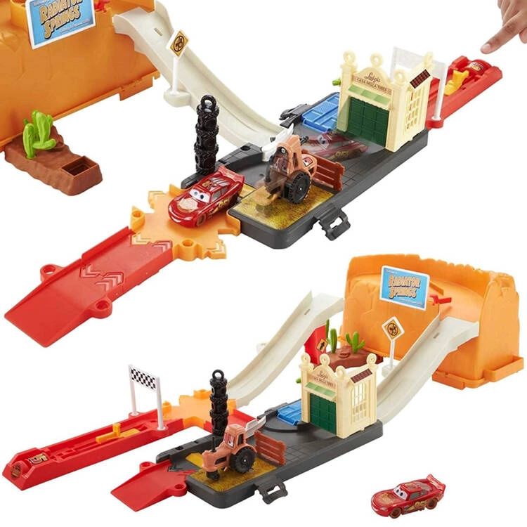 Baut eine Rennstrecke inspiriert von Radiator Springs und schießt Lightning McQueen per Druck auf die Taste mit der Nummer 95 los. Beobachtet, wie er rasant über die Rampen sprintet, enge Kurven nimmt und ins Ziel rast. Dank des durchdachten Designs ist die orangefarbene Box zugleich Spielelement – sie imitiert Felswände und nach dem Spielen lässt sich darin alles bequem verstauen.