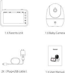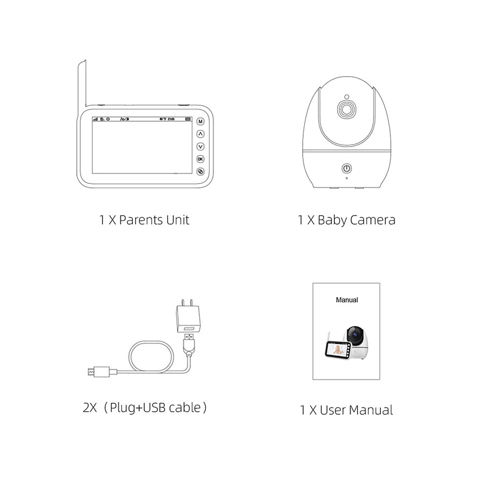 - Kamera, Elterneinheit mit Display, Netzadapter, USB-Kabel