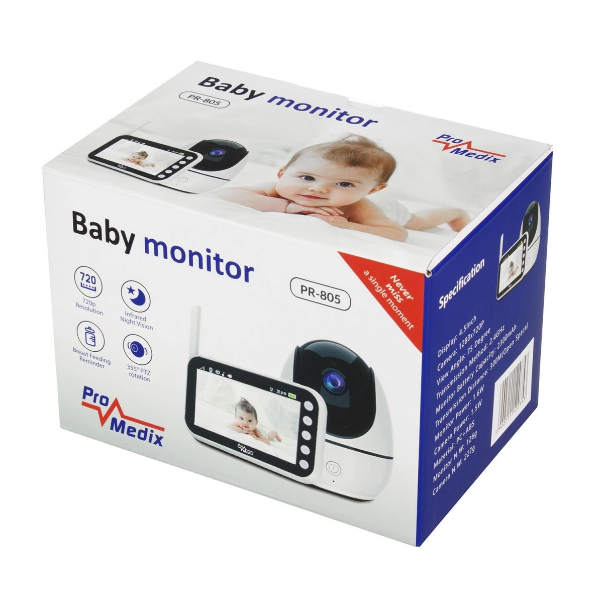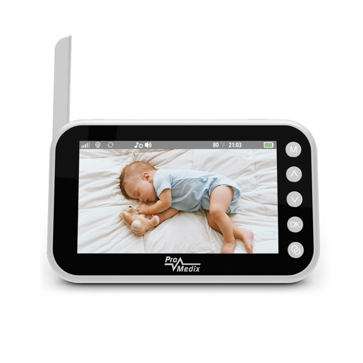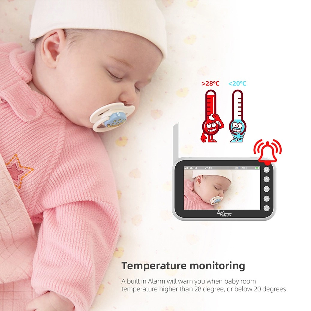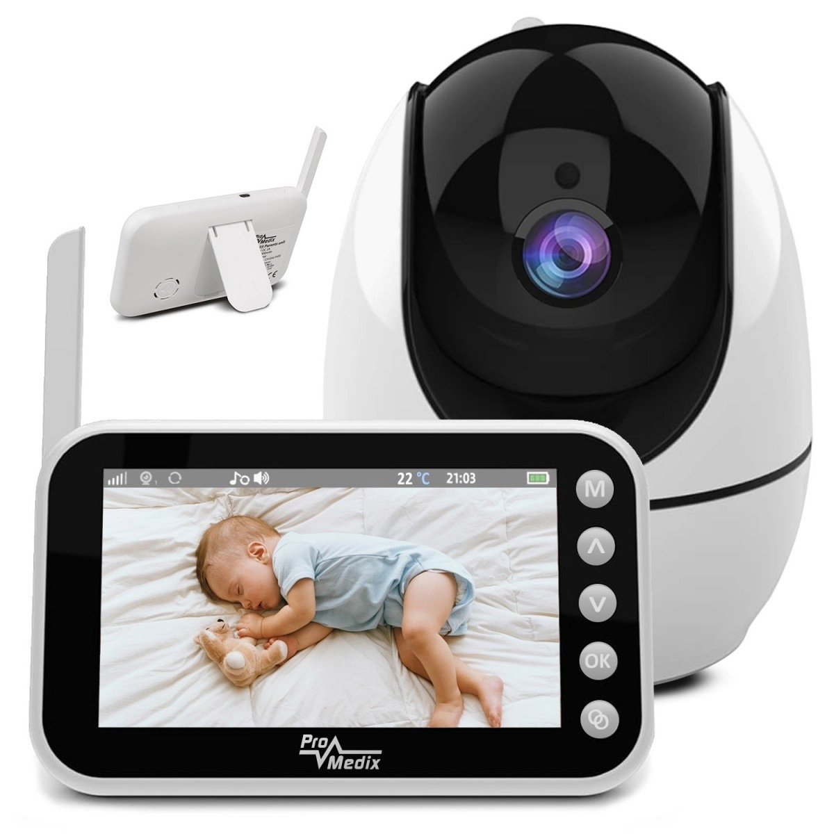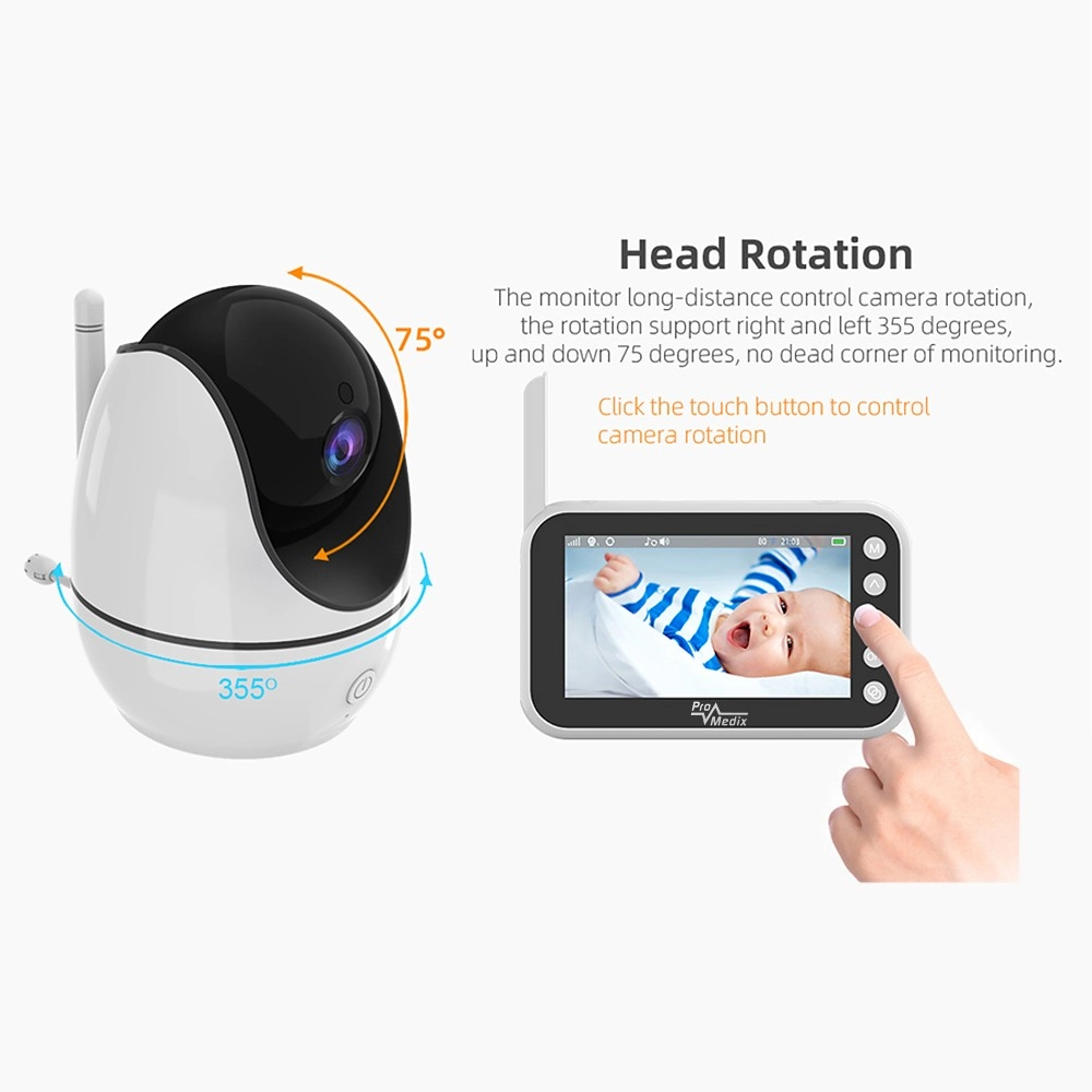 Das Babyphone PROMEDIX PR-805 sorgt bei Eltern für Ruhe dank der Kombination aus scharfem 720p-Bild, zuverlässiger Audioübertragung und Nachtsicht. Die kompakte Kamera mit 355° schwenkbarem Kopf und das tragbare Display mit Antenne ermöglichen eine bequeme Überwachung Ihres Babys bei Tag und Nacht – einfach, intuitiv und von überall im Haushalt.