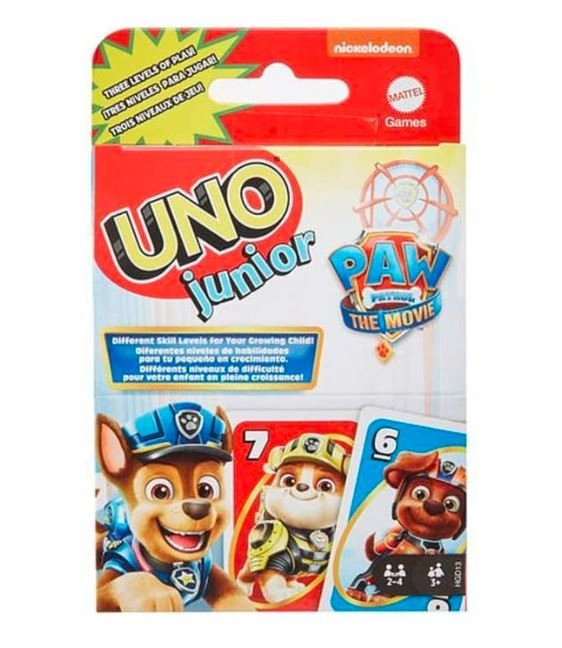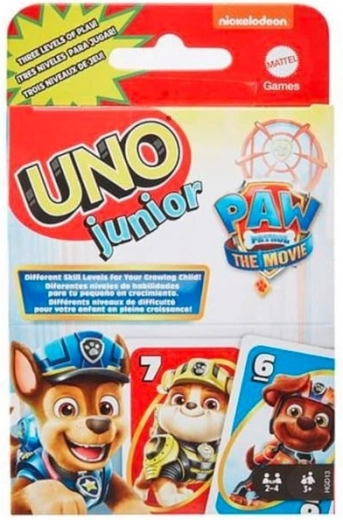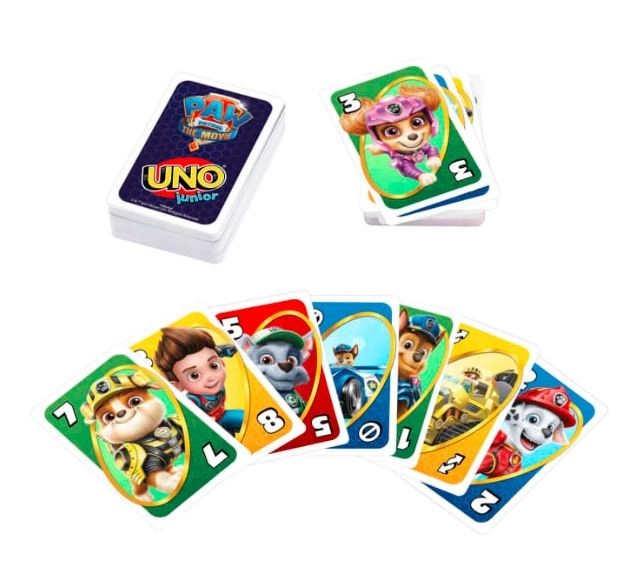 UNO Junior mit Motiven der PAW Patrol bringt einfache Regeln, große Ziffern und niedliche Illustrationen beliebter Helden wie Chase, Skye, Marshall, Liberty und ihres Freundes Ryder. Das Spiel wächst dank drei Stufen mit dem Kind mit – vom grundlegenden Zuordnen von Farben und Figuren bis hin zu speziellen Aktionskarten für ein flotteres Tempo.