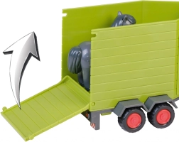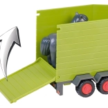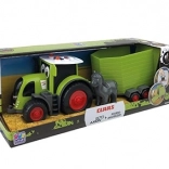 Dieser CLAAS-Traktor ist mit einem Anhänger zum Transportieren eines Pferdes und einer kleinen Pferdefigur ausgestattet. Traktor und Anhänger sind in grüner Farbe mit schwarzen Rädern und roten Details. Durch Drücken der entsprechenden Taste gibt der Traktor Motorgeräusche von sich und die Warnlichter leuchten auf.