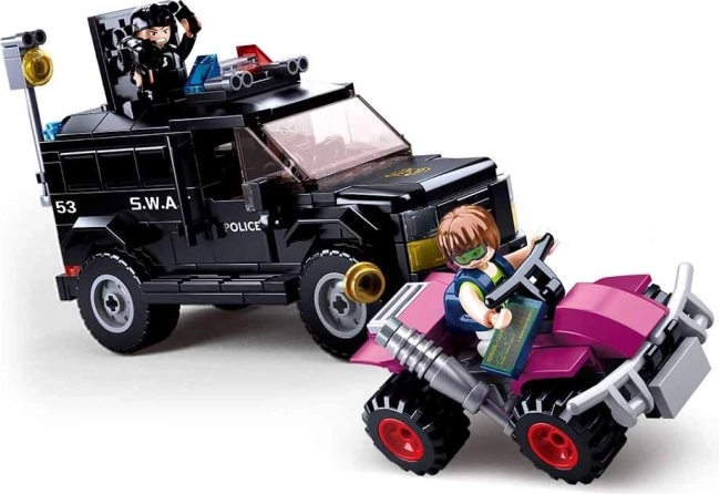 Dieses actionreiche SLUBAN POLICE Bauset bietet alles für dramatische Polizeieinsätze: ein robustes SWAT-Fahrzeug, das ATV-Quad des Flüchtigen und drei detailreiche Figuren mit Zubehör. Dank hochwertigem ABS-Kunststoff ist das Modell langlebig und bereit für viele Stunden Spielspaß.