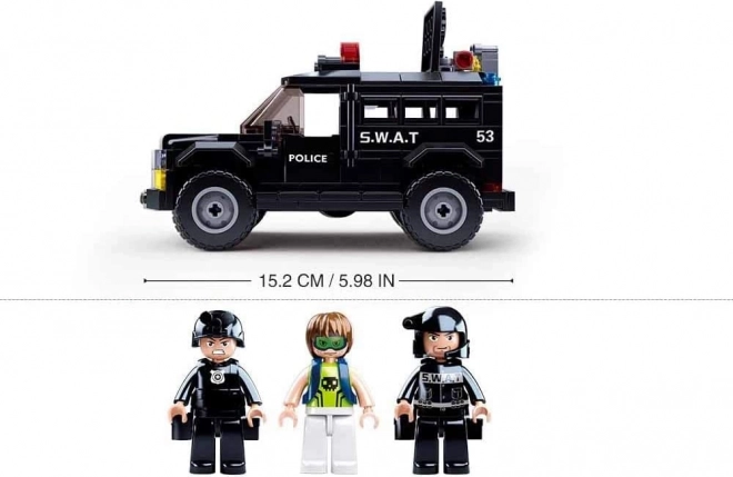 Schwarzes Polizeifahrzeug mit Dach für eine Figur, S.W.A.T.-Schriftzügen und realistischen Details wie Lichtern, Spiegeln und robusten Rädern.