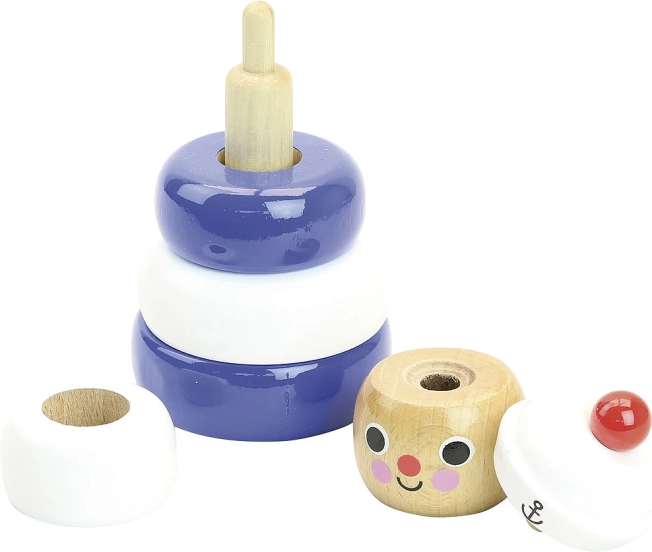 Dank des einfachen Stapelns unterschiedlich farbiger Teile fördert das Spielzeug die Feinmotorik der Kinder sowie deren Fähigkeit, Formen und Farben zu erkennen.