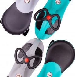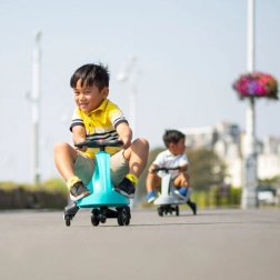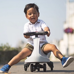 Der graue Didicar ist ein cleveres Rutschfahrzeug, das ohne Ketten, Motor und Batterien auskommt – es genügt, das Lenkrad von Seite zu Seite zu drehen. Dank niedrigem Schwerpunkt, bequemem Sitz und stabilem Unterbau ist die Fahrt sowohl im Innenbereich als auch draußen auf Asphalt oder Beton geschmeidig und sicher. Zertifizierungen für den europäischen und amerikanischen Markt unterstreichen den Fokus auf Sicherheit und Qualität.