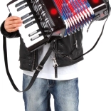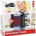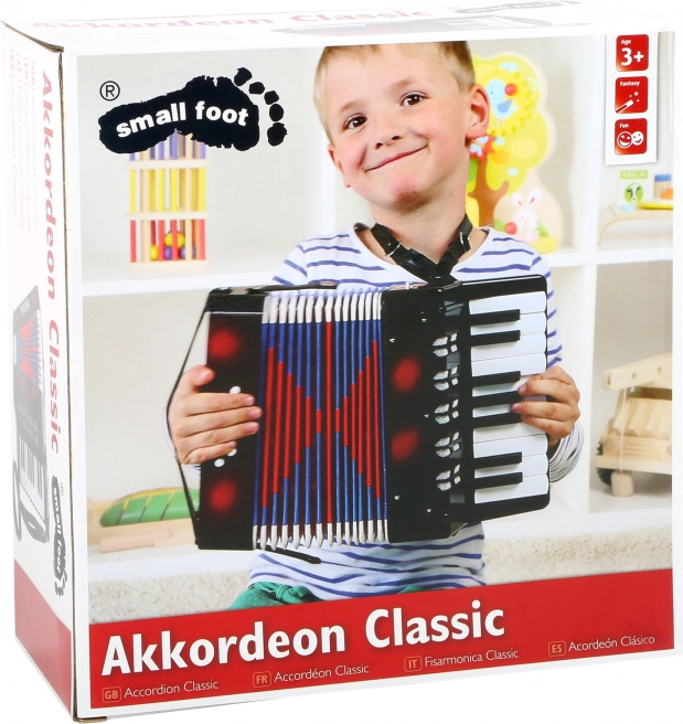Das Kinder-Akkordeon small foot Classic bringt Freude am Entdecken von Klängen und Rhythmen ins Kinderzimmer. Das leichte Kunststoffgehäuse, die kompakten Maße und die bequemen Gurte ermöglichen Kindern das Spielen im Stehen oder Sitzen ohne unnötige Anstrengung der Hände. Bunte Bälge und die glänzende Ausführung fallen sofort ins Auge.