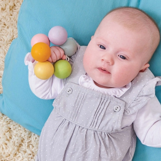 Pastellfarbene Holzperlen auf einem elastischen Gummiband liegen angenehm in der Hand und helfen, empfindliches Zahnfleisch beim Zahnen zu beruhigen.