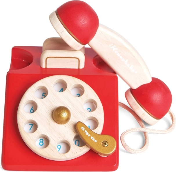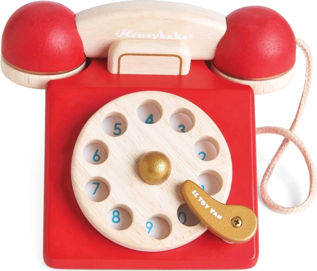 Entdecken Sie den Charme eines klassischen Telefons in kindgerechter Ausführung. Dieses Retro-Holztelefon von LE TOY VAN aus der Honeybake-Kollektion überzeugt mit sattem Rot, natürlichen Details und realistischen Elementen wie Drehscheibe und Klingel im Hörer. Das Spielzeug ist von Hand mit umweltfreundlichen Farben nachbemalt und auf Langlebigkeit ausgelegt.