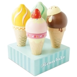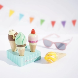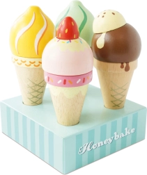 Das HONEYBAKE Holz-Eiscreme-Set von Le Toy Van verwandelt jedes Kinderzimmer in eine kleine Eisdiele. Vier unterschiedlich verzierte Kugeln auf natürlichen Waffeln sind mit umweltfreundlichen Farben auf Wasserbasis handbemalt und auf einem stilvollen Ständer übersichtlich präsentiert.