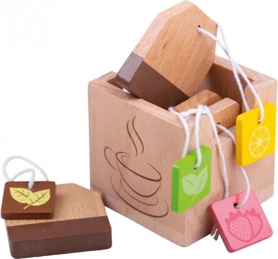 Das Set aus Holz-Teebeuteln ist die ideale Ergänzung für die Kinderküche oder den Kaufladen. Stilisierte Beutel mit beliebten Geschmacksrichtungen regen kreatives Spiel an und vermitteln Kindern Tischsitten sowie Höflichkeit beim Bewirten.
