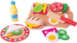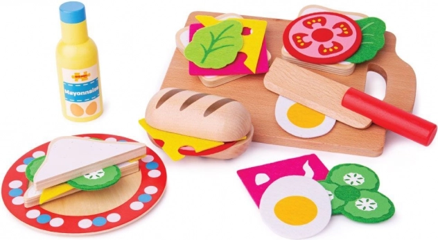 In der Box ist alles enthalten, um ein leckeres Sandwich zuzubereiten: Baguette, Brotscheiben, Mayonnaise, Salat, Gurke, Käse, Ei und Tomate, ergänzt durch Teller, Schneidebrett und Messer. Die Materialien stammen aus verantwortungsvollen Quellen und das Spielzeug erfüllt die europäischen Sicherheitsnormen, sodass Sie sich darauf verlassen können.