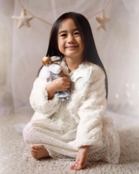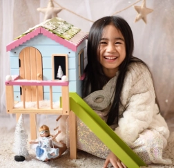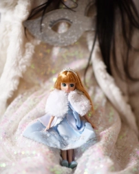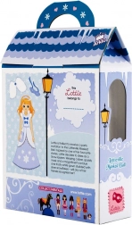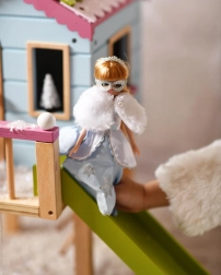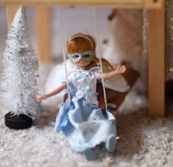 Die Puppe ist in schönen blauen Kleidern mit eisigen Details und silbernen Flöckchen gekleidet. Sie träumt von einem magischen Ball als Schneekönigin.