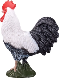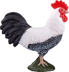 Detailgetreu geformtes Gefieder, kontrastreiche Schwarz-Weiß-Färbung und roter Kamm für ein authentisches Erscheinungsbild des Hahns.