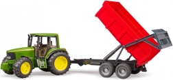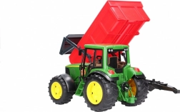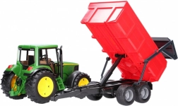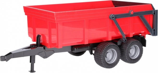 Der Anhänger mit kippbarer Mulde ist mit einer automatischen Heckklappe ausgestattet: Beim Kippen öffnet sie sich von selbst, im geschlossenen Betrieb bleibt sie verriegelt. Dank der Universal-Kupplung lässt er sich an die meisten BRUDER Traktoren und Maschinen ankuppeln.