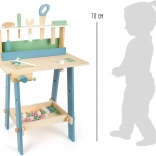 Robuste Holzkonstruktion mit funktionalen Elementen und Stauraum für Werkzeuge sorgt für sicheres und übersichtliches Spielen.