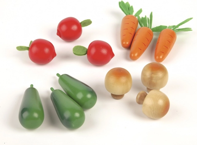 Das Set enthält eine Auswahl beliebter Gemüsesorten – Karotten, Zucchini, Tomaten und Pilze – verstaut in einer robusten Holzkiste. Alles ist sorgfältig aus hochwertigen und verantwortungsvoll gewonnenen Materialien gefertigt, sicher für das kindliche Spiel.