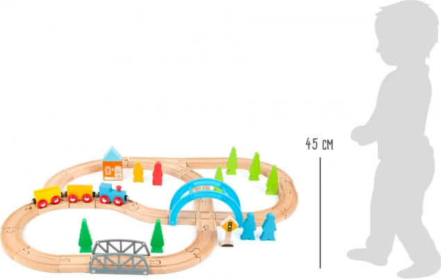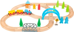 Das Set umfasst eine Lokomotive mit Waggons, eine Brücke, ein Häuschen, Bäume, Figuren und Verkehrselemente für realistische Szenarien. Natürliches Holz in Kombination mit kräftigen Farben wirkt attraktiv und fördert die Sinneswahrnehmung. Dank der Kompatibilität mit weiteren Holzsystemen können Kinder ihre Schienenwelt leicht erweitern.