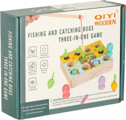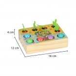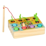 Nehmen Sie Ihr Kind mit an den Teich und in den Garten – ganz ohne das Haus zu verlassen. Die massive Holz-Basis verbirgt Öffnungen für Fische, Würmchen und bunte Möhrchen. Kinder angeln sie mit der magnetischen Angel oder ziehen sie an den Filzblättchen heraus und trainieren dabei ganz natürlich den Pinzettengriff und das Fingerspitzengefühl.