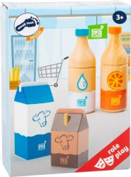 Gönnen Sie Ihren Kindern ein unterhaltsames Spiel mit dem vierteiligen Getränkeset, das einen Löffel Orangensaft, eine Wasserflasche, eine Packung frische Milch und einen kleinen Kakao mit Strohhalm enthält. Dieses Set ist ideal für Küchen- oder Einkaufsspiele.