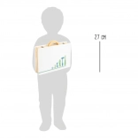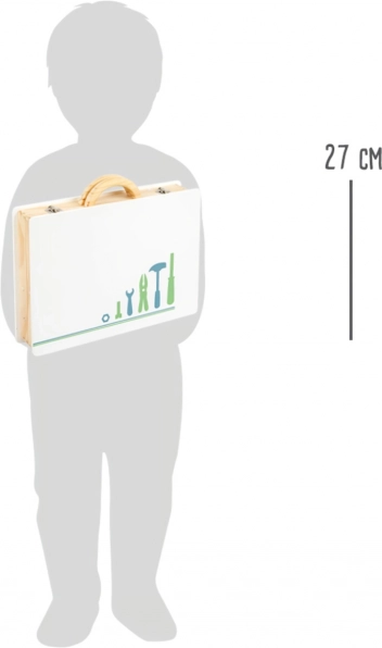 Sein zuverlässiger Metallschluss und der an Kinderhände angepasste Griff sorgen für einfaches Tragen. Das Set besteht aus einer Kombination von Sperrholz und Massivholz, wodurch es hohe Langlebigkeit und viele nützliche Verbesserungen bietet. Kinder können zwischen verschiedenen Dekoren wählen: Werkstatt Miniwob und skandinavisch Nordic.