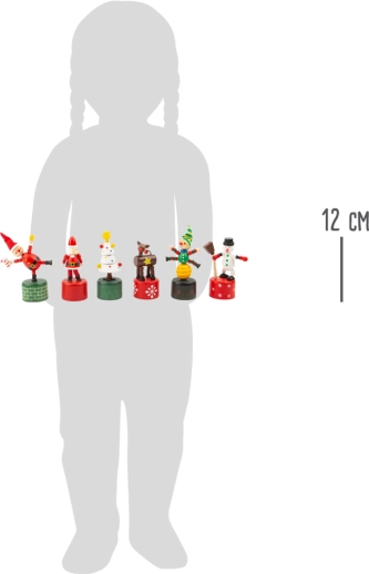 Set mit 12 Stück. Bewegt sich der Schneemann wirklich? Ja, genau! Mehrere weihnachtliche Holzfiguren schwingen hin und her – aber nur, wenn man den Knopf an der Unterseite ihres Sockels drückt. Ideal als Geschenk in der Adventszeit.