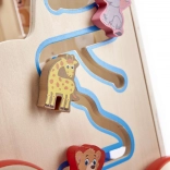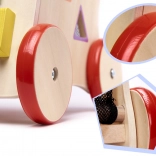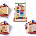Alle Teile des Lauflernwagens sind sorgfältig geschliffen, um kleine Hände vor Splittern zu schützen, und mit ungiftigen, umweltfreundlichen Farben bemalt. Die Konstruktion ist stabil, mit Holzrädern, die mit Gummi ummantelt sind, um mehr Sicherheit zu bieten. An den Seiten des Lauflernwagens befinden sich außerdem ein Formsortierer mit vier bunten Würfeln und ein Labyrinth mit niedlichen Tieren.