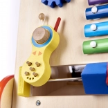 An der Vorderseite befindet sich ein Brett, das voller interaktiver Elemente zur Sinnesentwicklung des Kindes ist, darunter Uhren, Zahnräder und Glockenspiele.