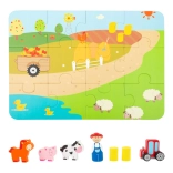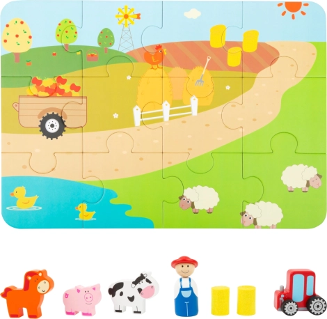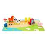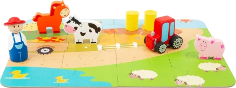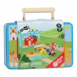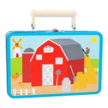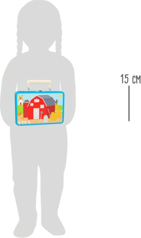 Das Schwein grunzt, der Traktor brummt. Ein tragbares Spiel in einem schönen Koffer: Kinder können dank der Spielfiguren in Form eines Traktors, von Haustieren und eines Bauern aus Holz ihren eigenen Bauernhof gestalten. Zuerst aus den Puzzleteilen die Basis legen und dann kann das Spiel beginnen! Heuballen-Figuren vervollständigen den Hof. Tauchen Sie in das Landleben ein und lassen Sie Ihrer Fantasie freien Lauf. Der Koffer besteht aus robustem Metall, der Griff ist aus Holz, das Schloss lässt sich leicht öffnen. Geeignet für Kinderzimmer, Spielzimmer... Hauptmerkmale: enthält 12 Puzzleteile sowie Bauer, Traktor, Schwein, Kuh, Pferd und Heuballen; praktische Verpackung – Metallkoffer mit Holzgriff