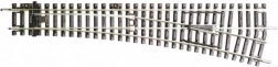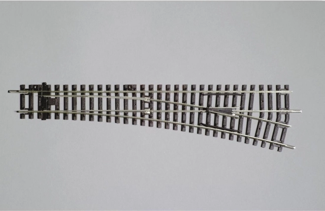 Weiche mit detailgetreuer Nachbildung der Holzschwellen in authentischen Farben. Kombiniert ein gerades Gleis und einen 15°-Bogen nach rechts und kann manuell bedient werden. Möglichkeit zum Anschluss eines ferngesteuerten Antriebs.