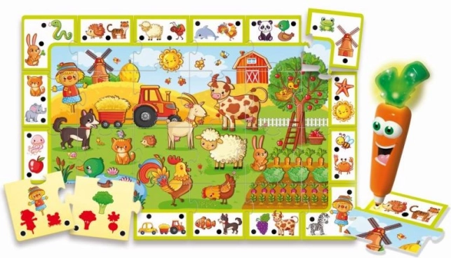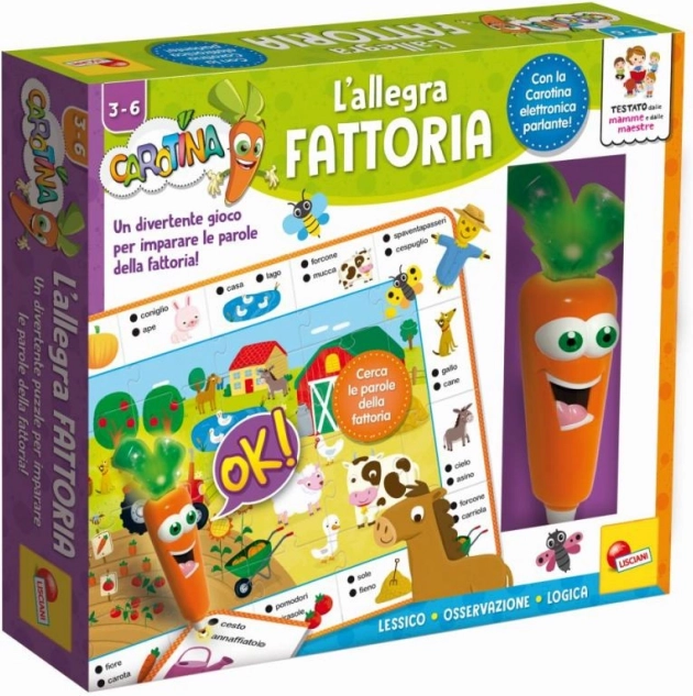 CAROTINA von LISCIANI bringt spielerisches und lehrreiches Lernen rund um das Landleben. Kinder setzen ein Bild aus beidseitigen Teilen zusammen und beantworten mithilfe des sprechenden Stifts – der Karotte – einfache Quizfragen. Der interaktive Ansatz motiviert zum Entdecken und Lernen durch Spiel.