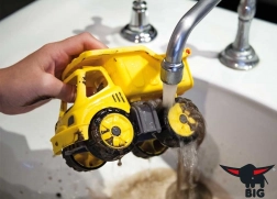Das Spielzeug imitiert große Baufahrzeuge und zieht durch seine leuchtend gelbe Farbe die Aufmerksamkeit jedes kleinen Baumeisters auf sich.